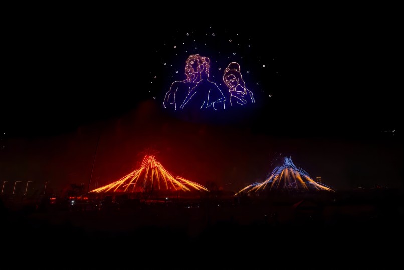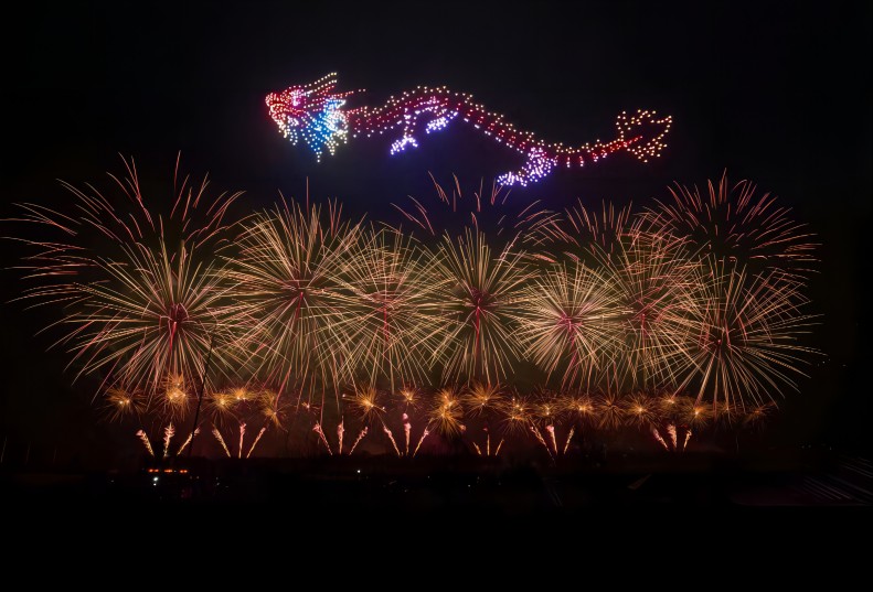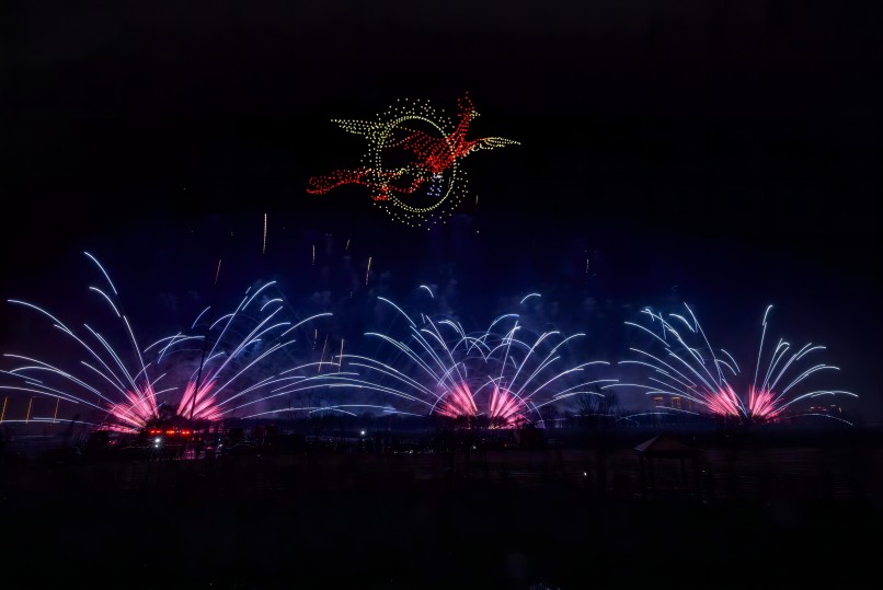 在煙花秀表演期間,由1000架無(wú)人機(jī)組成無(wú)人機(jī)群在空中組成了多個(gè)畫(huà)面,“鳩茲和鳴”鳩鳥(niǎo)飛舞栩栩如生,還有“龍呈祥瑞”金龍昂首喚春歸。