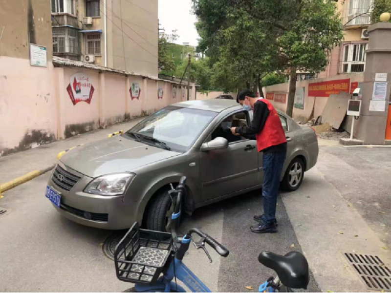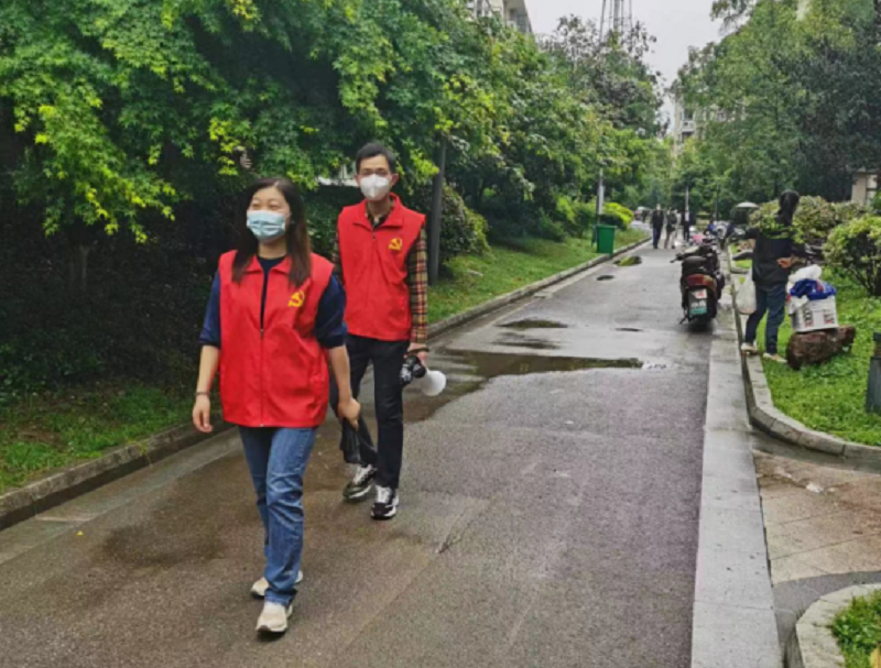 黨員志愿者在社區(qū)內(nèi)巡邏,向社區(qū)居民宣傳疫情防控知識,及時(shí)發(fā)現(xiàn)和堵塞防控漏洞。