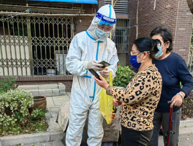 部分黨員志愿者在鏡湖區(qū)某封控社區(qū)內(nèi)對居家隔離人員進(jìn)行上門核酸檢測。